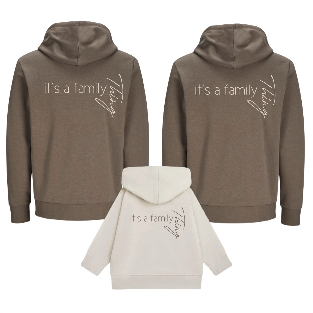 Wij voorzien de Matching familie hoodies set it´s a family thing met eigen voorletters van opdrukken die met een hoge druk en warmte op de truien bedrukt worden.