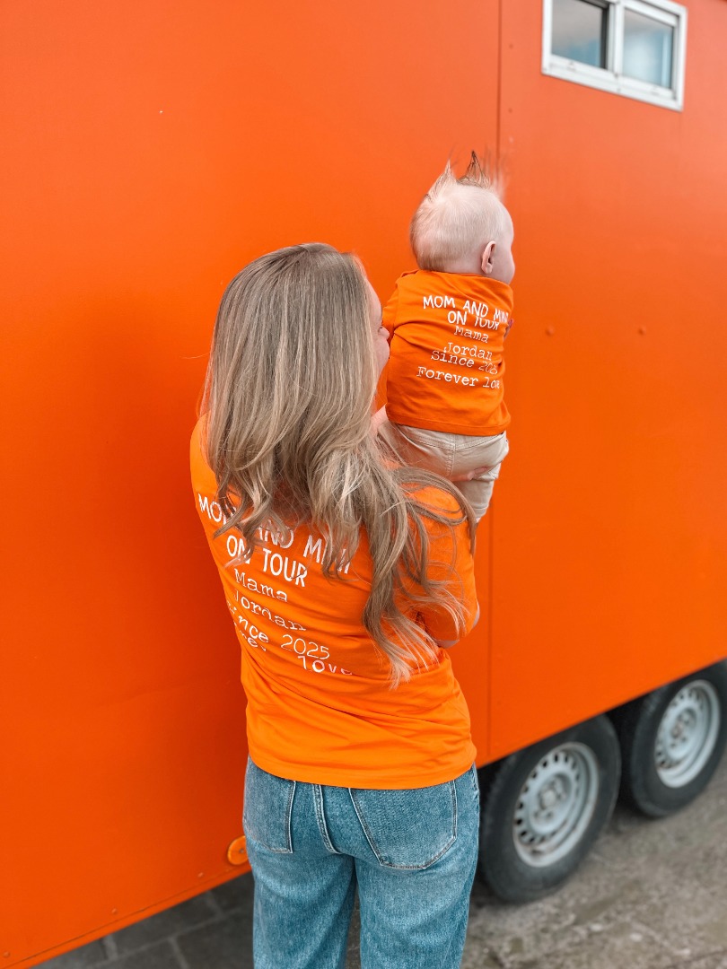 Wij voorzien de Matching Koningsdag T-shirt voor moeder en kind - Mom and mini on tour gepersonaliseerd van opdrukken die met een hoge druk en warmte op de T-shirts bedrukt worden.