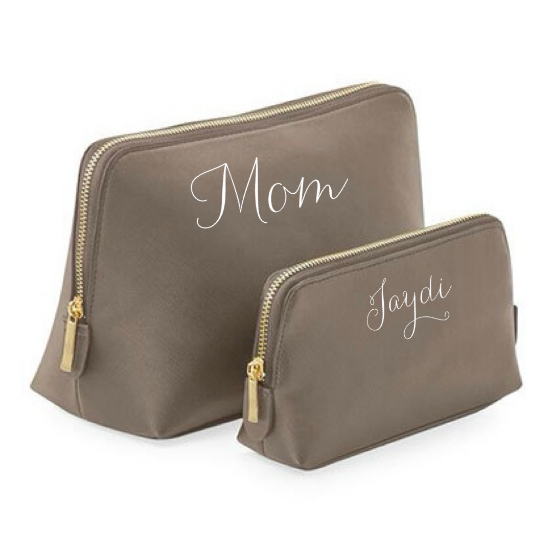 Wij personaliseren deze Moederdag cadeau matching make-up tasjes voor moeder en dochter - Mom en Kindernaam met een hoge druk en warmte.